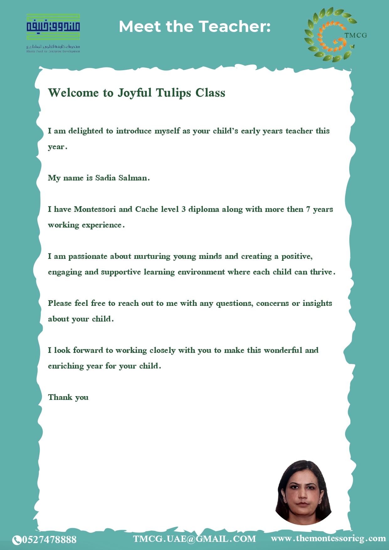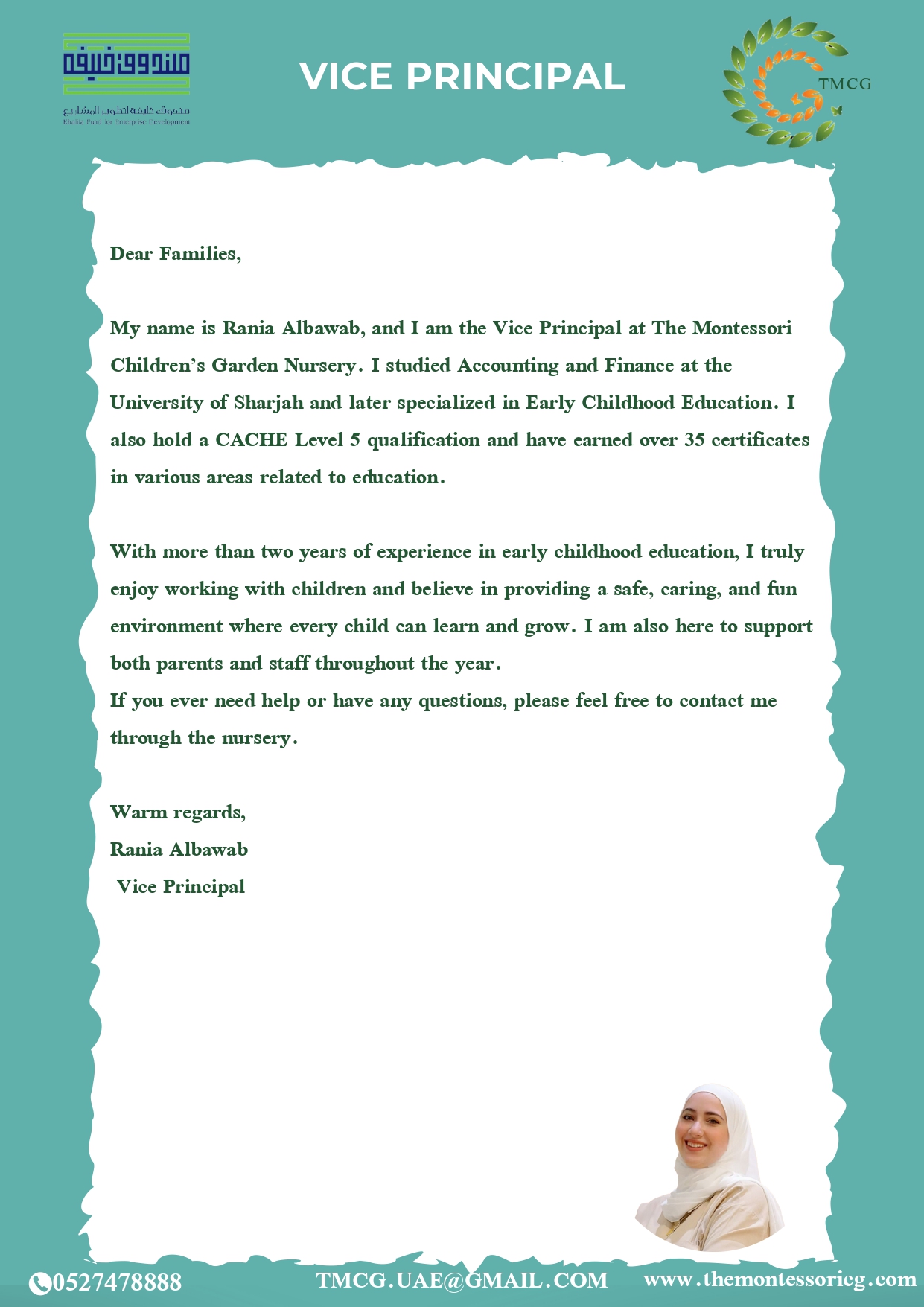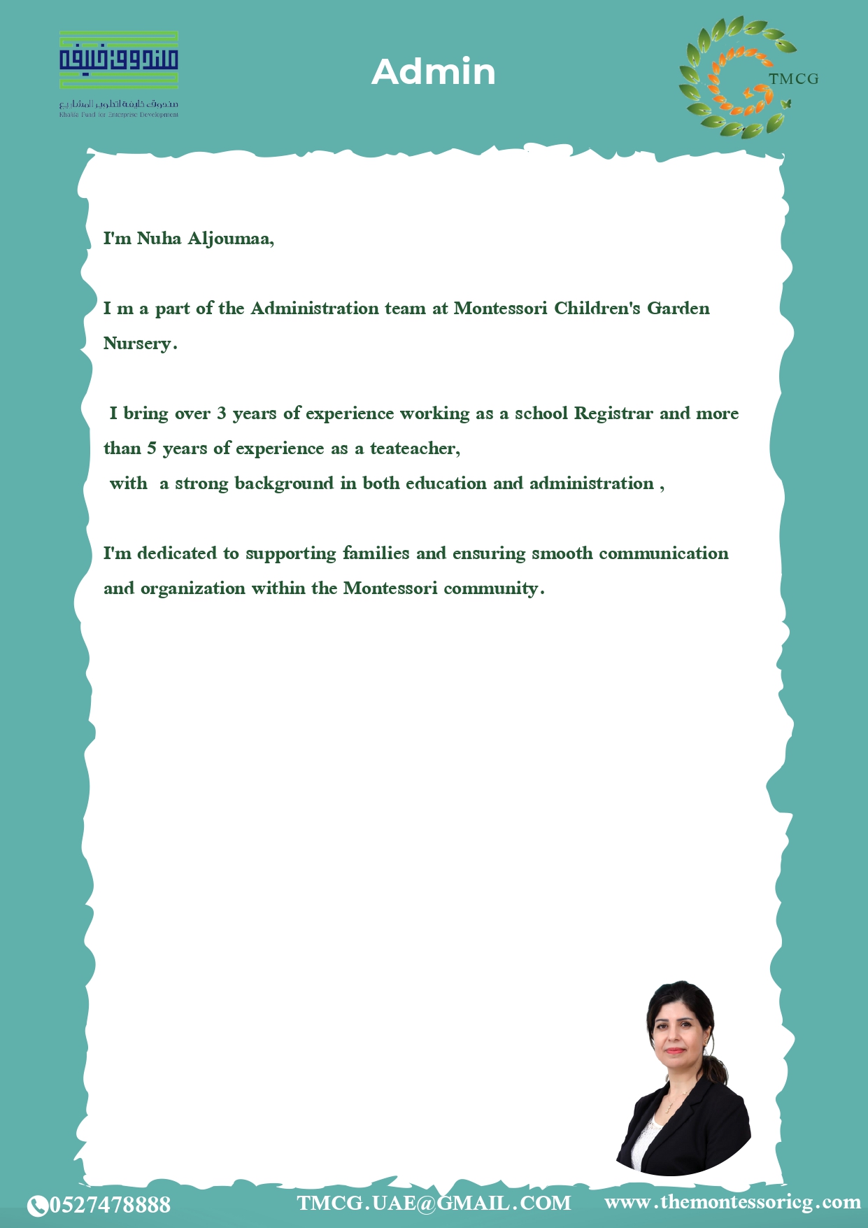 With over 3 years of experience as a school registrar and 5 years as a teacher, Nuha supports families and ensures smooth communication and organization within our nursery community.
