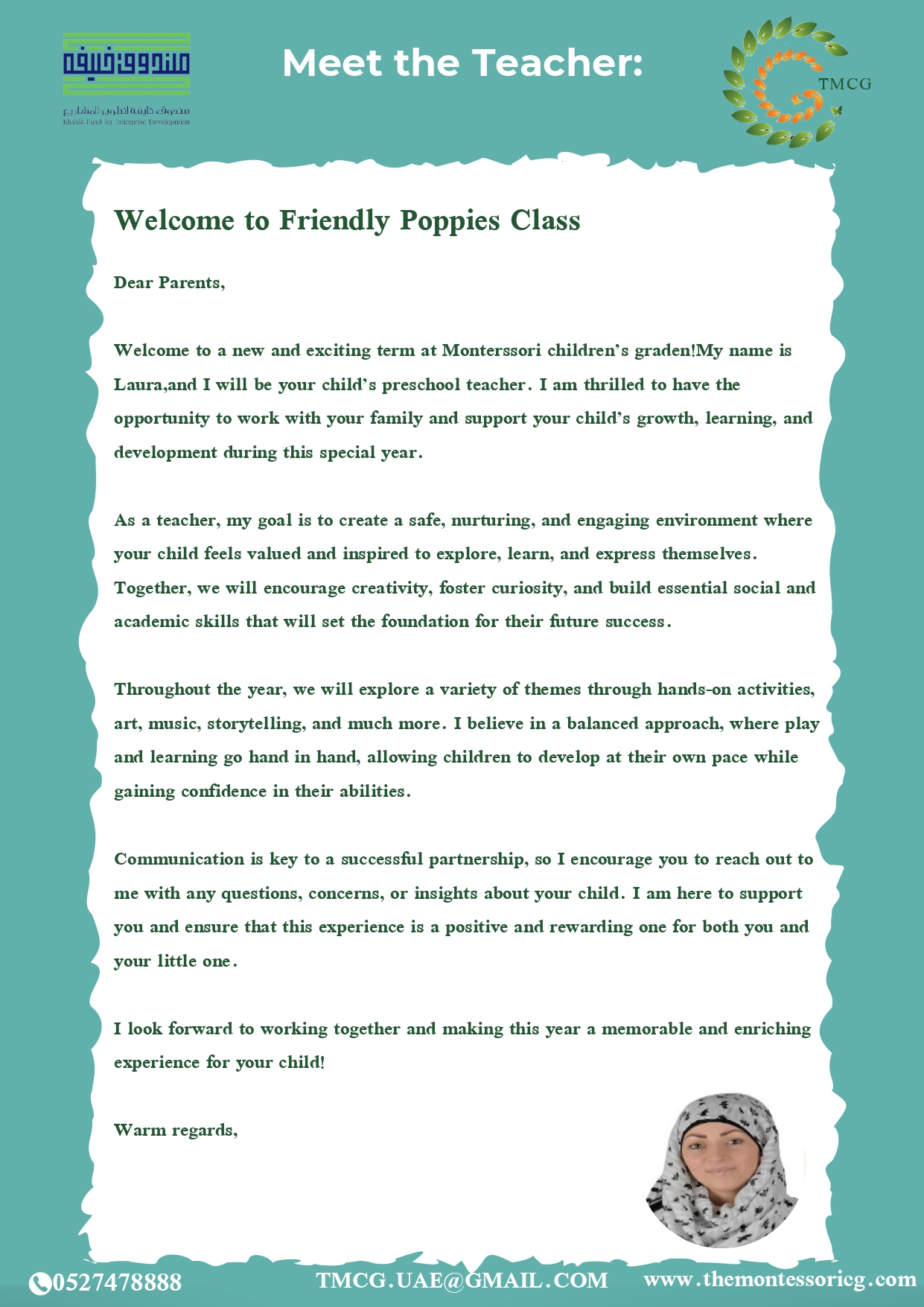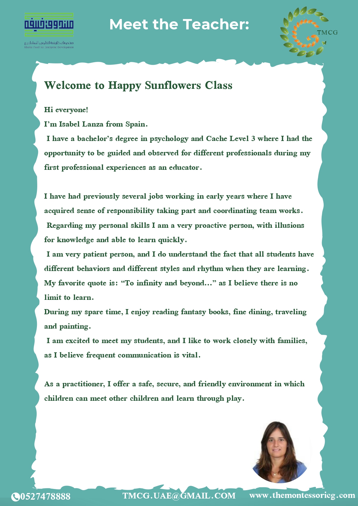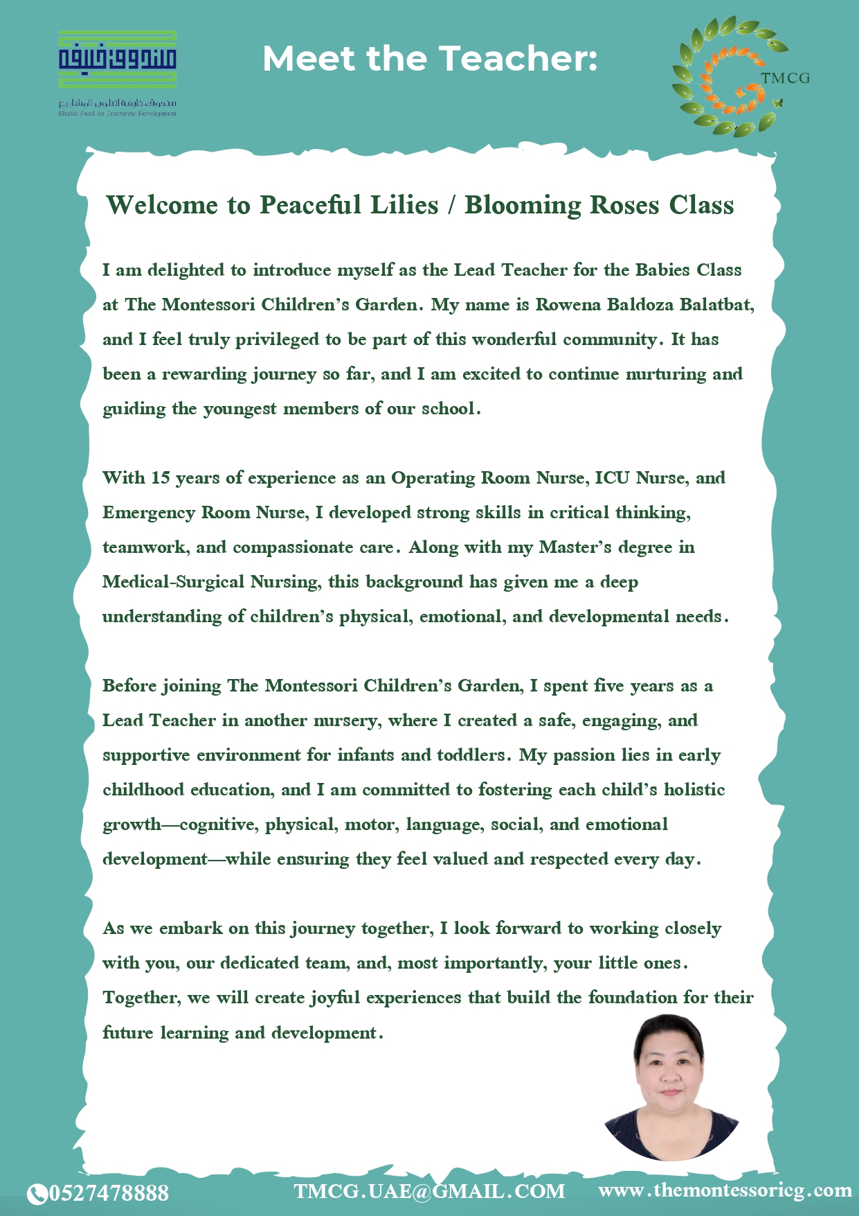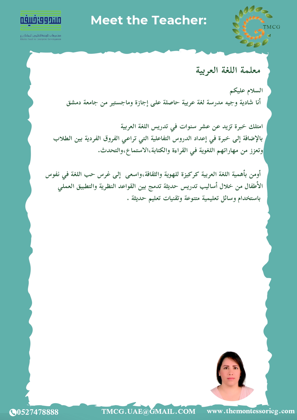 With over 3 years of experience as a school registrar and 5 years as a teacher, Nuha supports families and ensures smooth communication and organization within our nursery community.