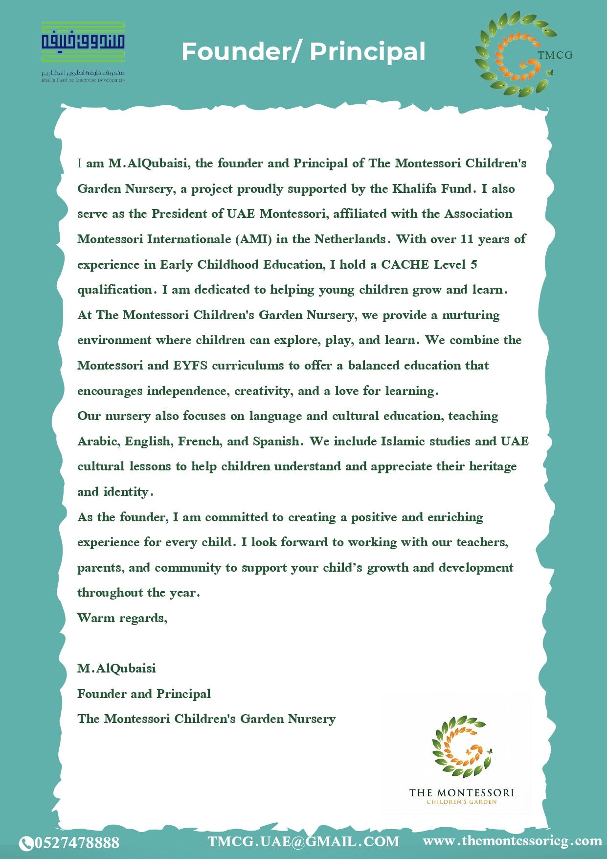 Our nursery embraces cultural education, offering Arabic, English, French, and Spanish, along with Islamic and UAE heritage lessons. Together with our dedicated team and supportive parents, we strive to create a joyful environment that fosters every child’s growth and development.