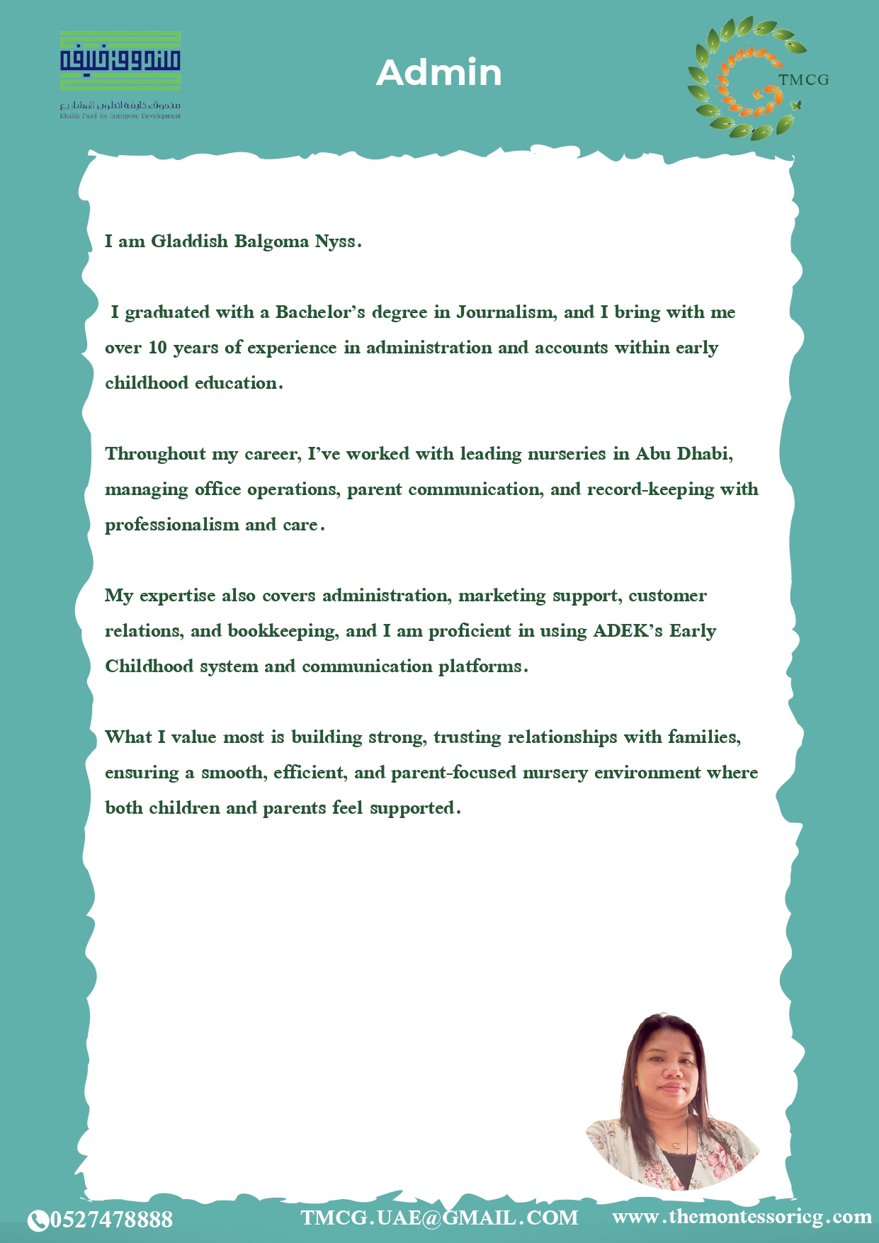 Gladdish brings 10 years of experience in administration and accounts, managing office operations, parent communication, and record-keeping. She is passionate about building trust and maintaining a supportive environment for families.