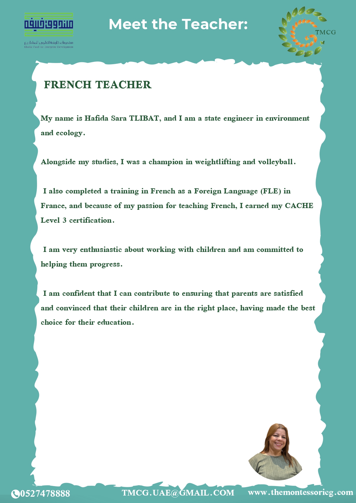 Hafida is a State Engineer in Environment and Ecology and holds a CACHE Level 3 certification. With a strong passion for teaching French, she integrates fun, culture, and language learning in her classes, helping children build a love for communication and confidence.