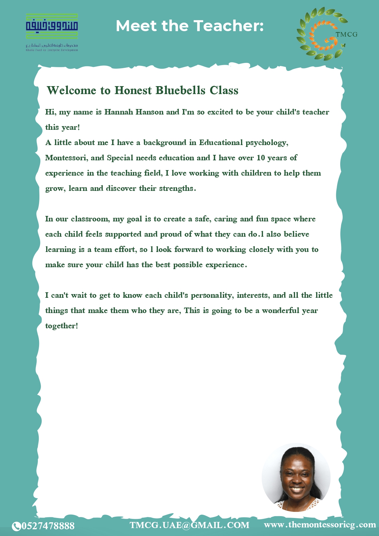 Hannah has over 10 years of experience in Educational Psychology, Montessori, and Special Needs education. She believes in creating a caring, fun classroom where each child feels supported and proud of their achievements. Her goal is to help children learn through joy and curiosity.