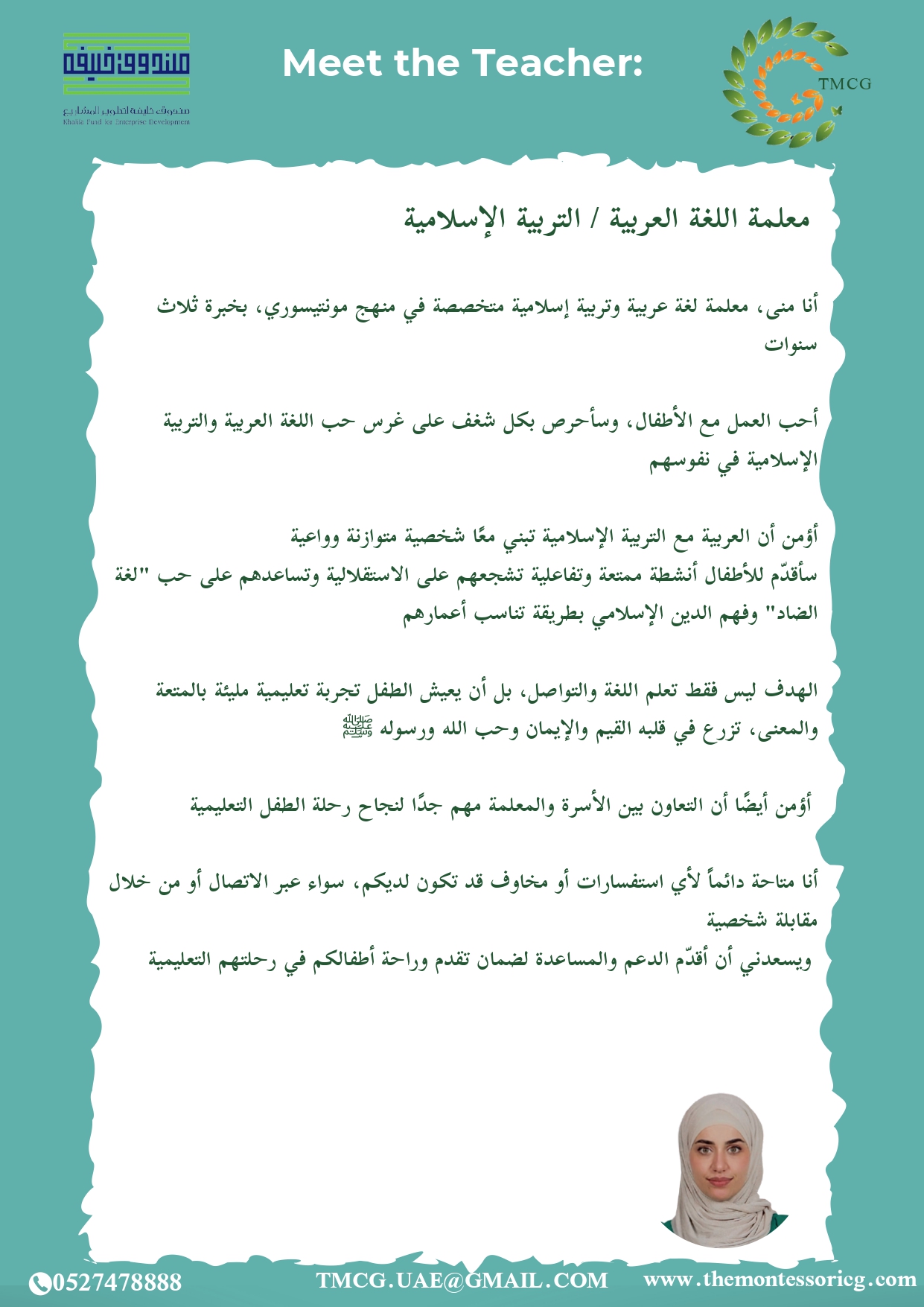 Mona is an Arabic and Islamic Studies teacher with 3 years of Montessori experience. She aims to instill love for the Arabic language and Islamic values in children through engaging, hands-on activities. She believes in a collaborative approach between teachers and families to support children’s growth.