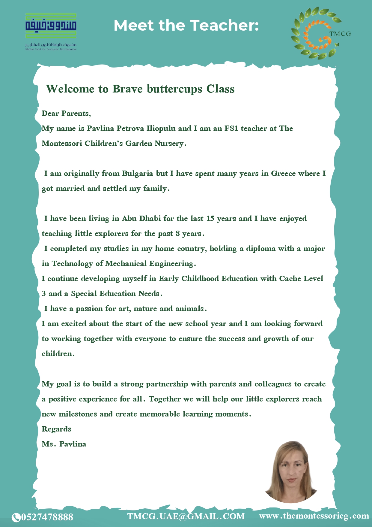 Pavlina, originally from Bulgaria, has 8 years of experience in early years education and 15 years of residence in Abu Dhabi. She holds qualifications in Mechanical Engineering, CACHE Level 3, and Special Educational Needs. Pavlina values art, nature, and teamwork in supporting each child’s learning journey.